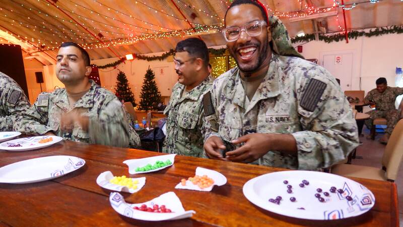 Laughter is always part of the fun. Service members shared plenty of laughs while playing holiday games together when the USO visited Bahrain. | Photo credit USO Photo