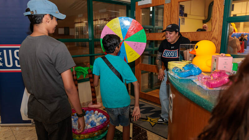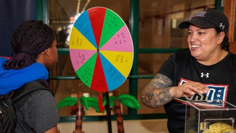 Joanna (right) welcomes service members to the USO table for games, dancing, and a spin of the prize wheel—complete with fun giveaways. | Photo credit USO Photo